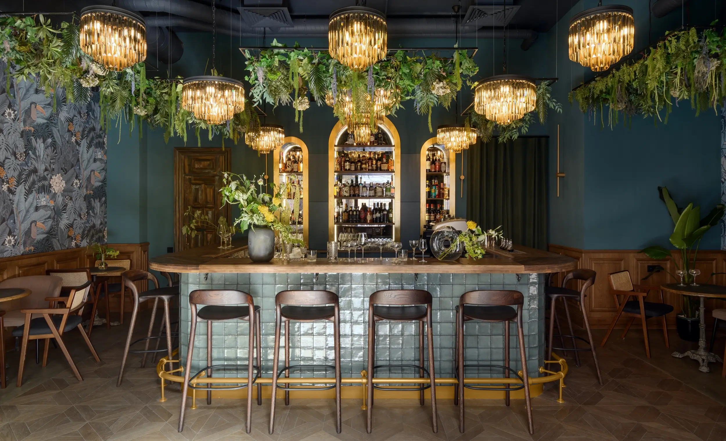 The main element of the bar was a large U-shaped bar with a solid oak wooden countertop and a composition of stunning crystal chandeliers. It was an adaptation of early 20th century interiors to modern realities. High arched niches decorated with brass behind the bar give the bar individuality and severity.