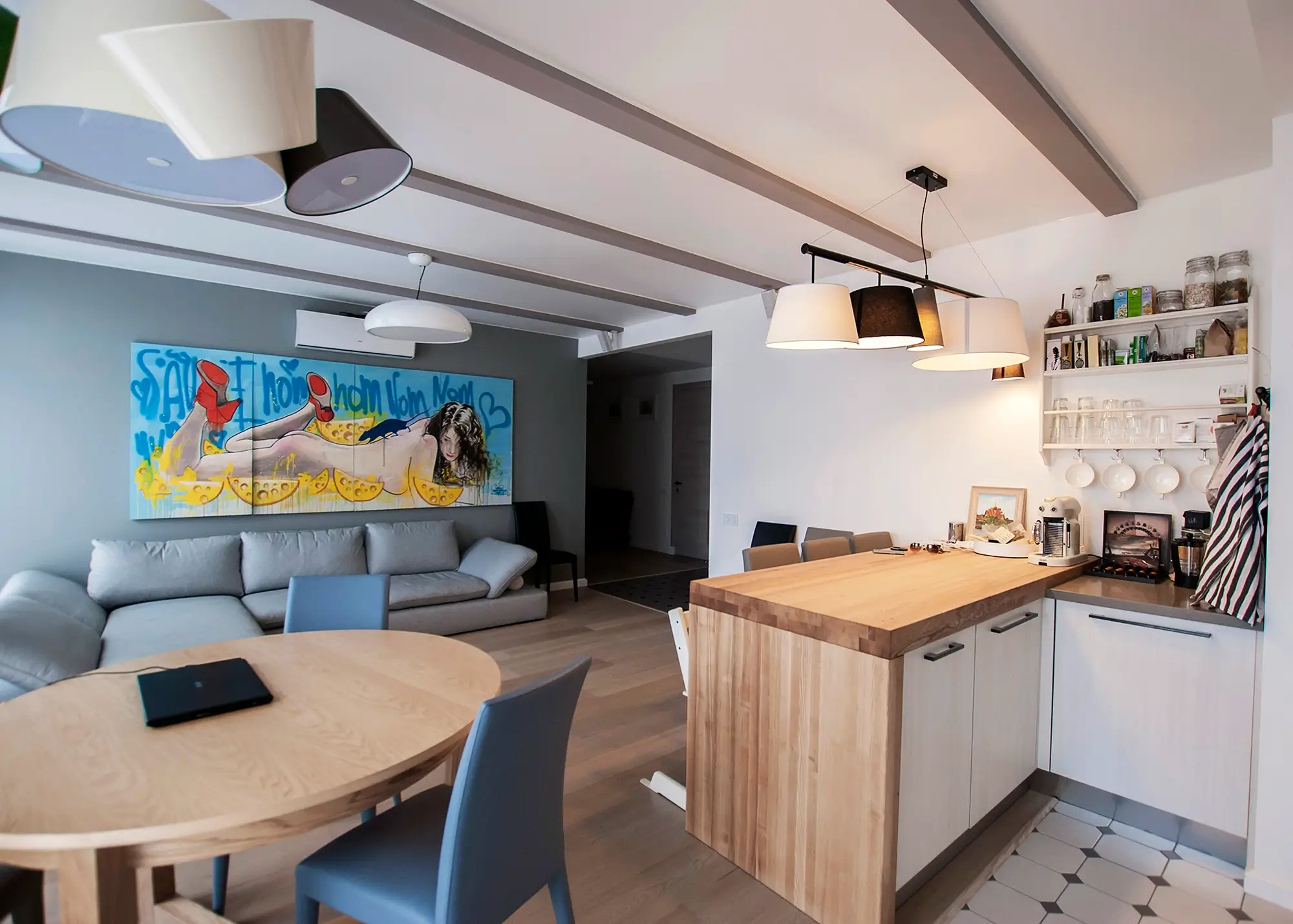 Apartment for a large and friendly family! We needed to think of an apartment for a family of 4+ people, with both a place for privacy and space for general gatherings. The spacious kitchen-living room accommodated a compact peninsula for breakfast, a large table for lunch-dinners with friends, and a soft cozy sofa, above which a favorite painting of a famous artist.