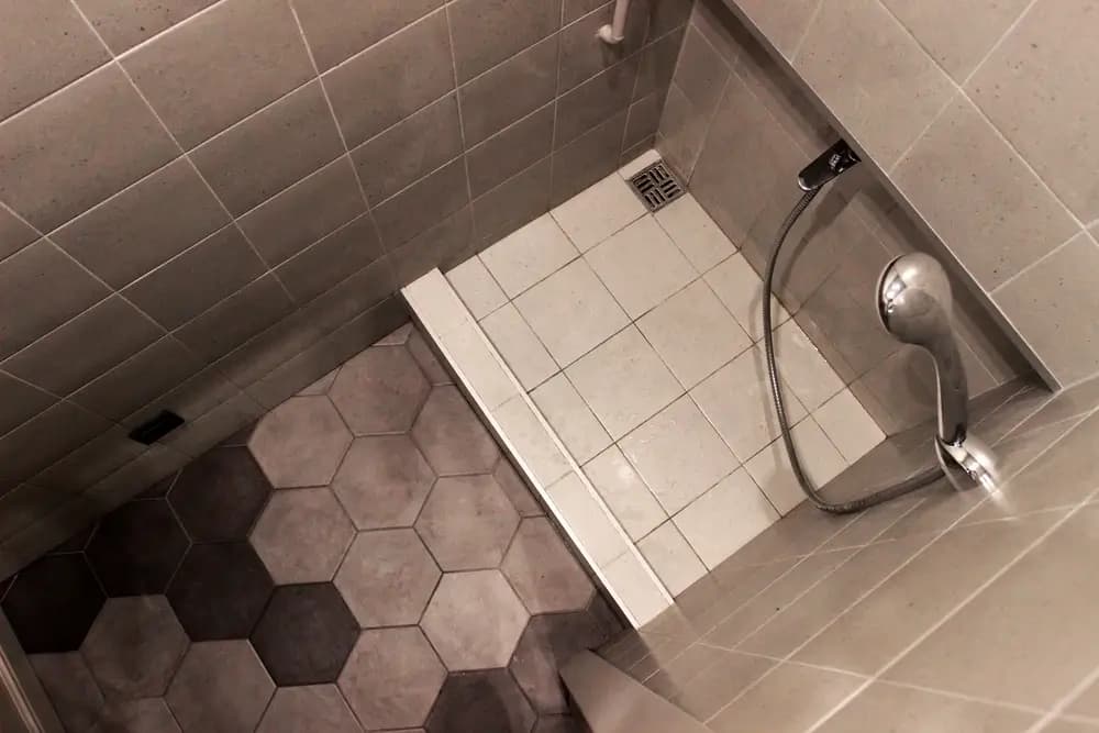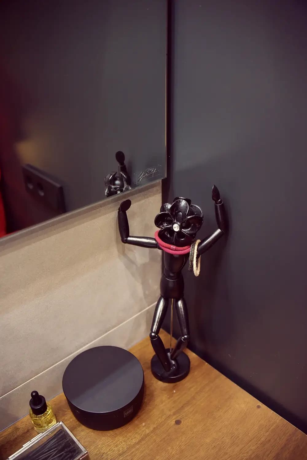 In the toilet and bathroom, only the walls that are directly exposed to the wet zone were tiled, while the rest was given a black damp paint.