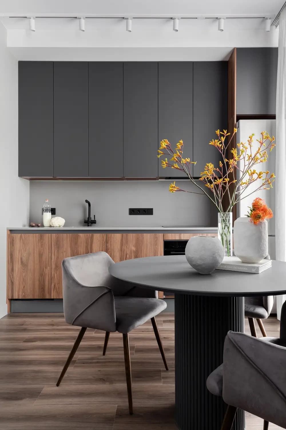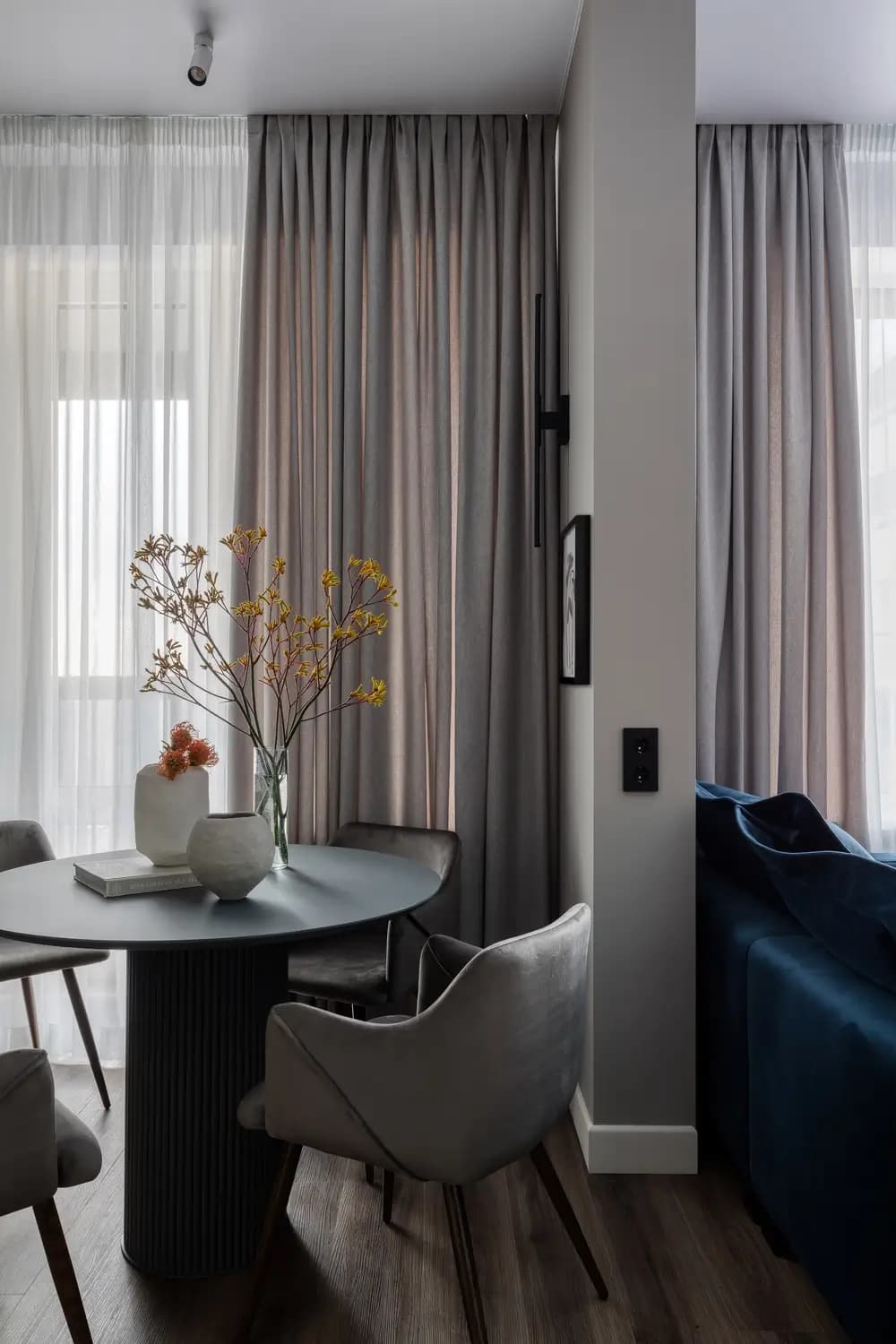 We designed this small apartment for our old clients, with them we completed the construction of a large apartment in the luxury Residential Complex few years ago. Although the area is small, only 46m2 including a 6m2 balcony, working with such clients was a pleasure! They were open to any proposals for re-planning, zoning, and equipping. The only thing that remained unchanged while working with them was the elegant grey-white color scheme, with wooden elements and contrasting details and furniture.