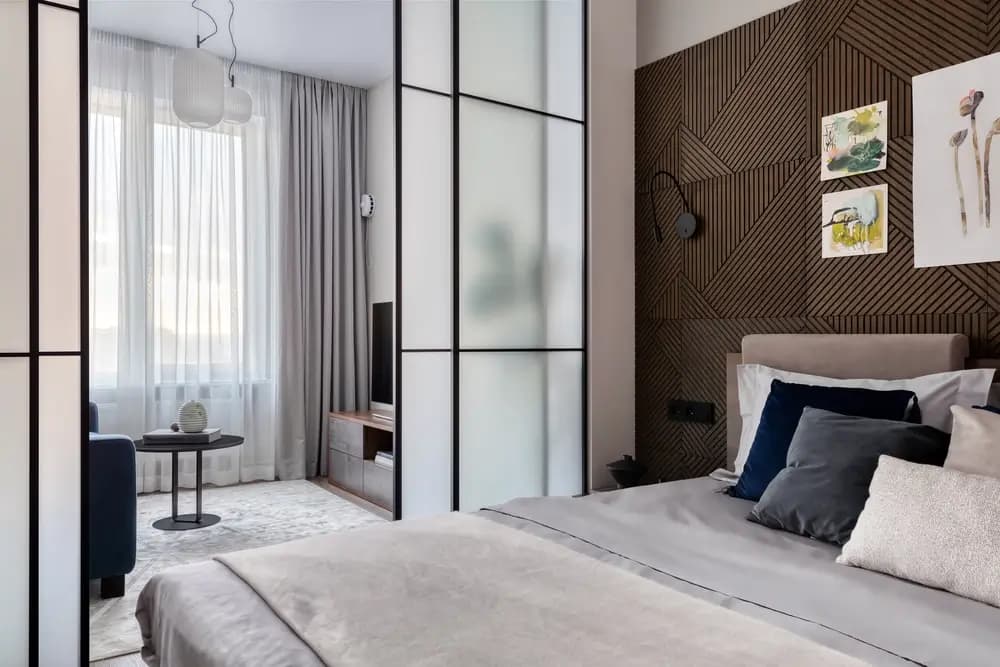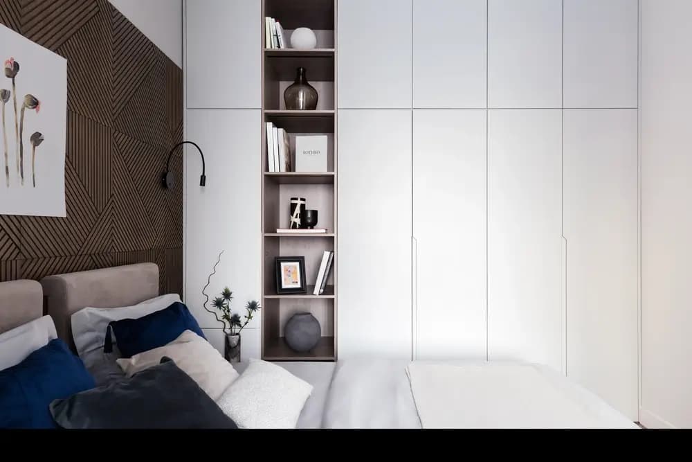 In the bedroom, we planned a built-in wardrobe with swinging doors and one open section for books and decor. The small bedroom space itself was separated from the living room by a very beautiful sliding system up to the ceiling, with white matt glass to provide privacy.
