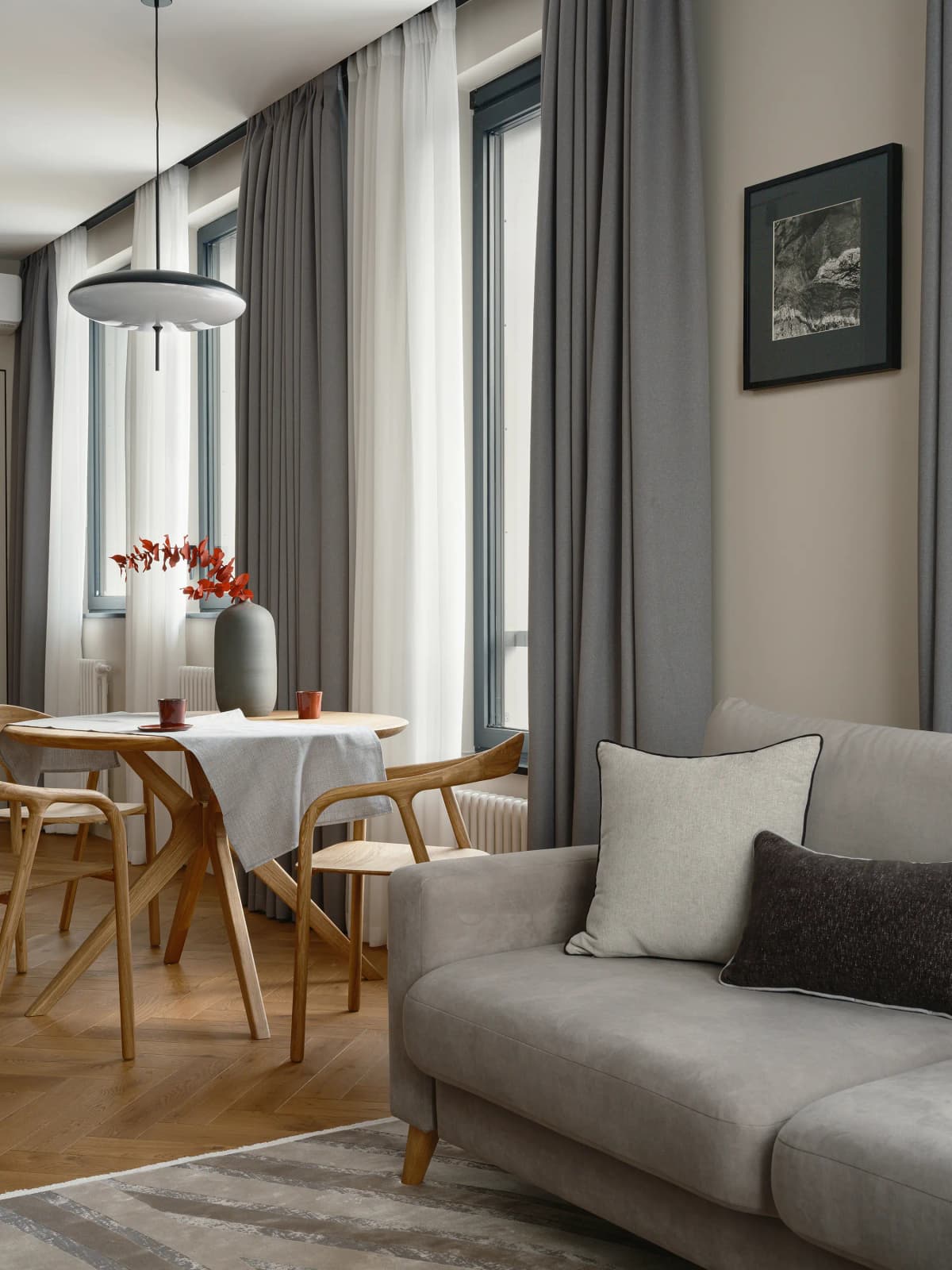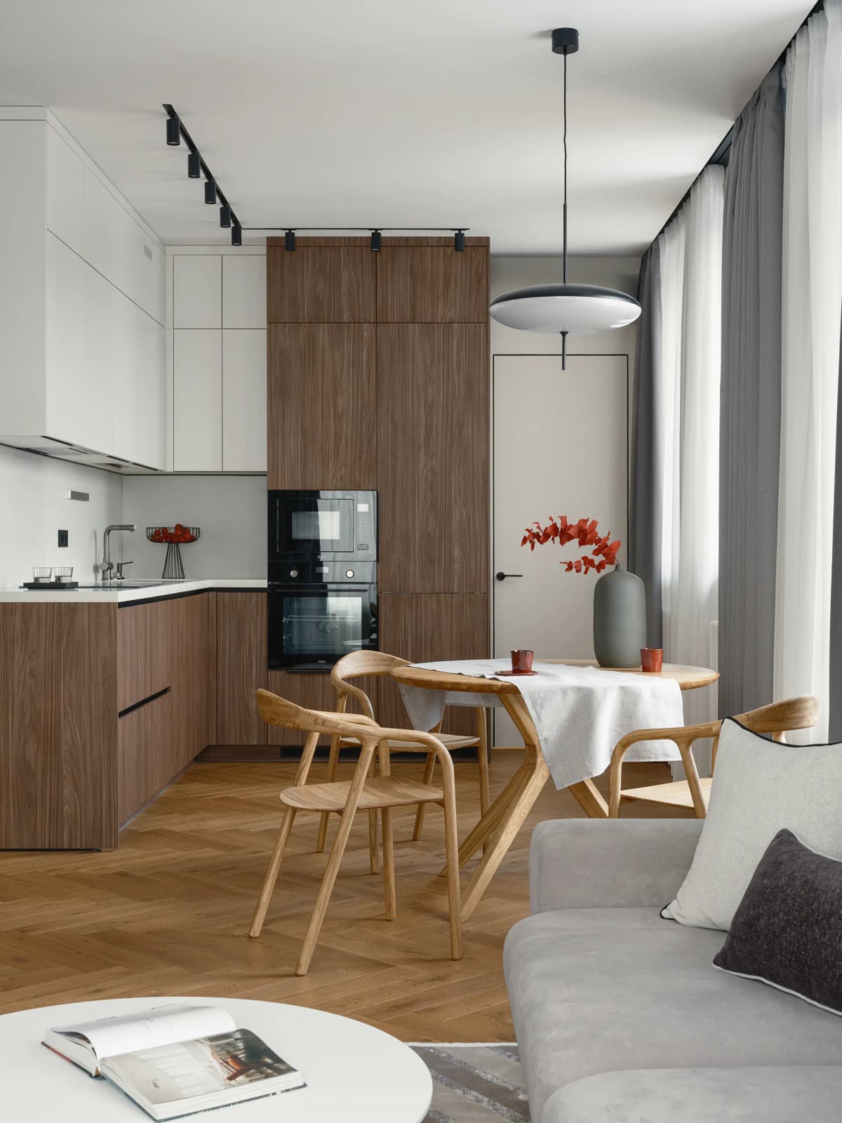 This modern apartment interior design project was created for a young couple living in a contemporary residential complex. At the start of the project, we explored a wide range of planning scenarios, aiming to improve functionality and comfort without unnecessary structural changes.