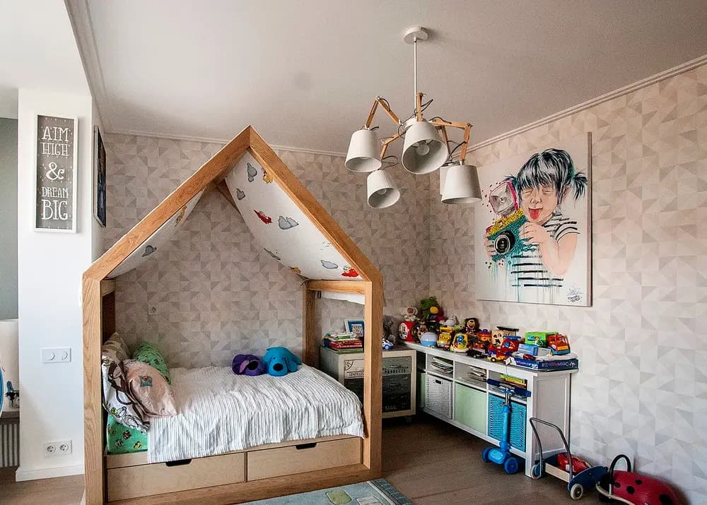 Optimizing an already created project was not difficult for us: we ordered a comfortable two-story bed, a large children’s wall with ropes, hooks and fasteners for climbing.