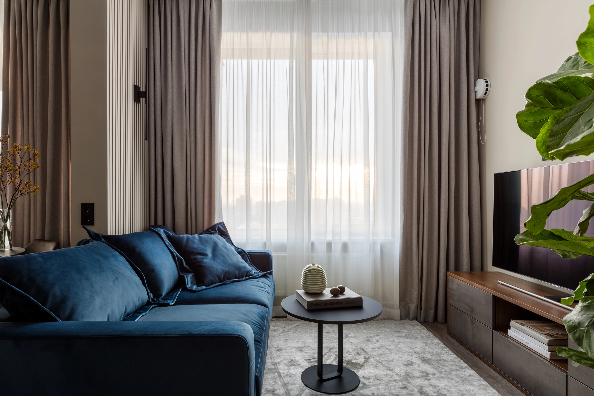 The living room is furnished with a comfortable wide sofa, deep blue in velour upholstery.