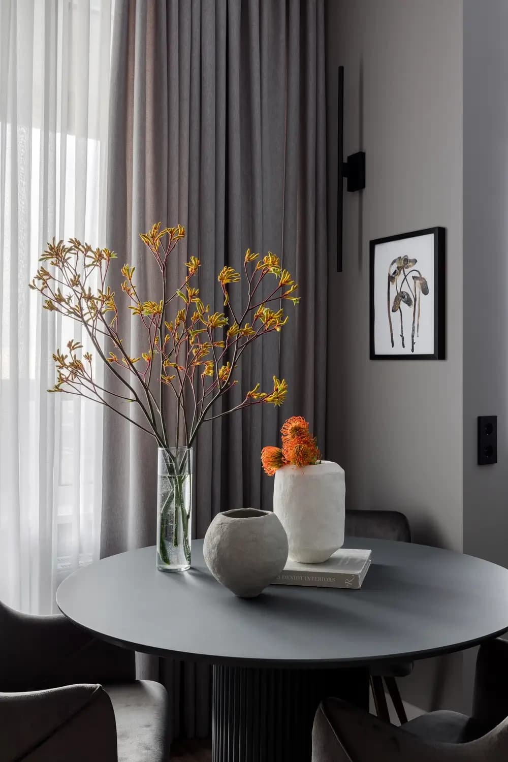 We designed this small apartment for our old clients, with them we completed the construction of a large apartment in the luxury Residential Complex few years ago. Although the area is small, only 46m2 including a 6m2 balcony, working with such clients was a pleasure! They were open to any proposals for re-planning, zoning, and equipping. The only thing that remained unchanged while working with them was the elegant grey-white color scheme, with wooden elements and contrasting details and furniture.
