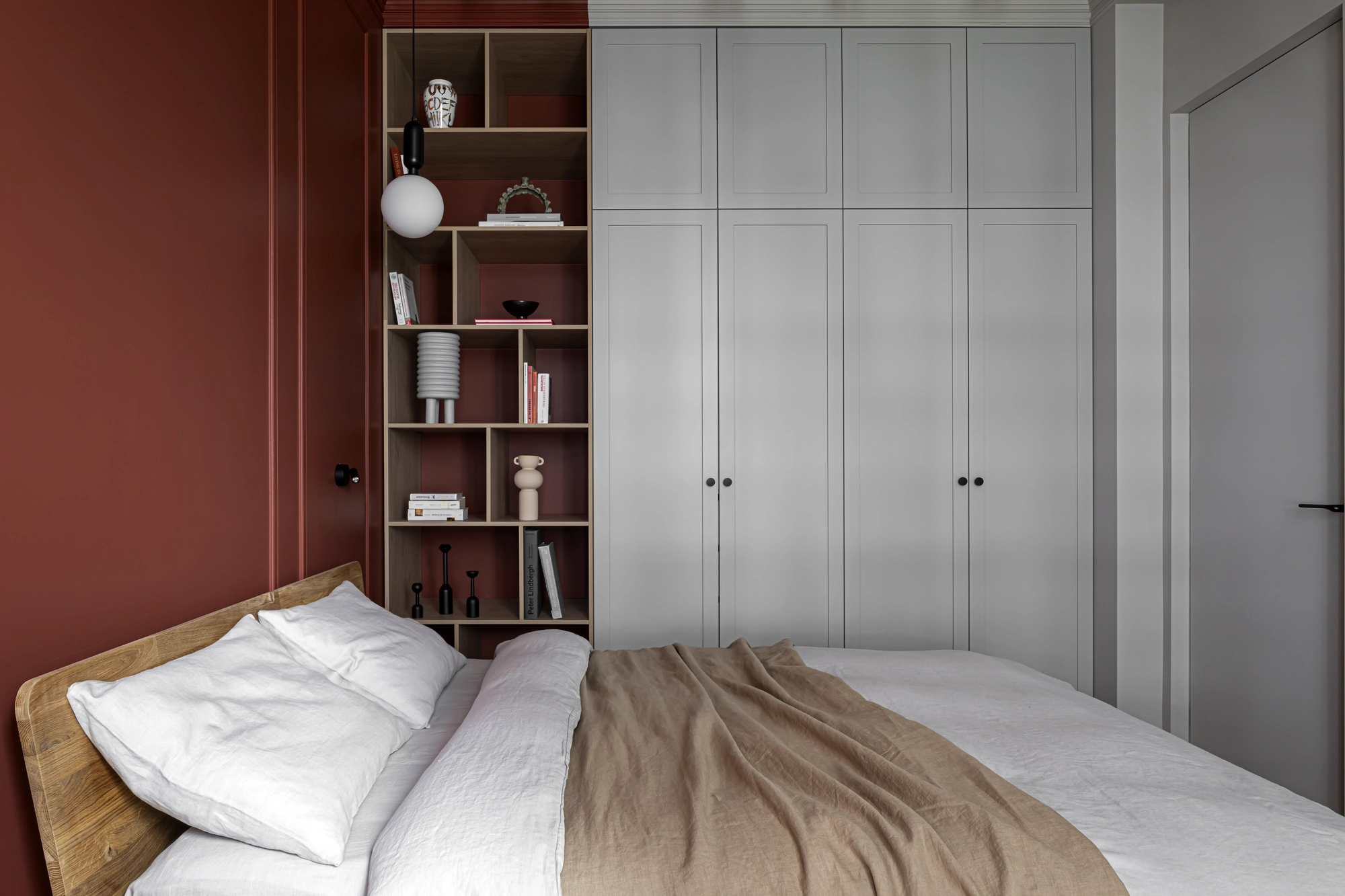 The vibrant terracotta hue adorns both the bedroom walls and ceiling, as well as the curtains. The wall behind the bed resembles a niche and matches the wooden bed and the open part of the wardrobe perfectly. The doors are tall, and the installation is hidden, with black hardware and sockets, all serving as modern design features.