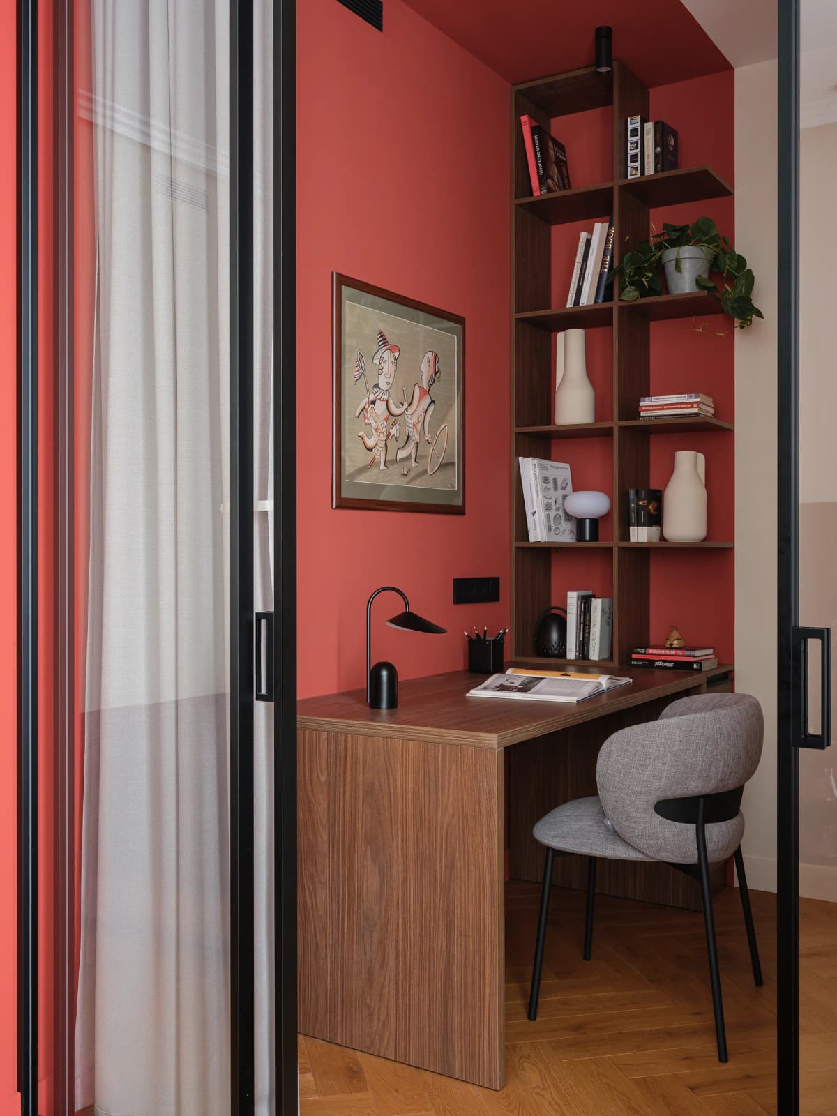 A compact additional workspace is integrated into the bedroom — an essential, highly practical feature for clients who often work remotely. This dual-office approach optimizes the apartment for contemporary lifestyles, making it suitable for long-term working from home.