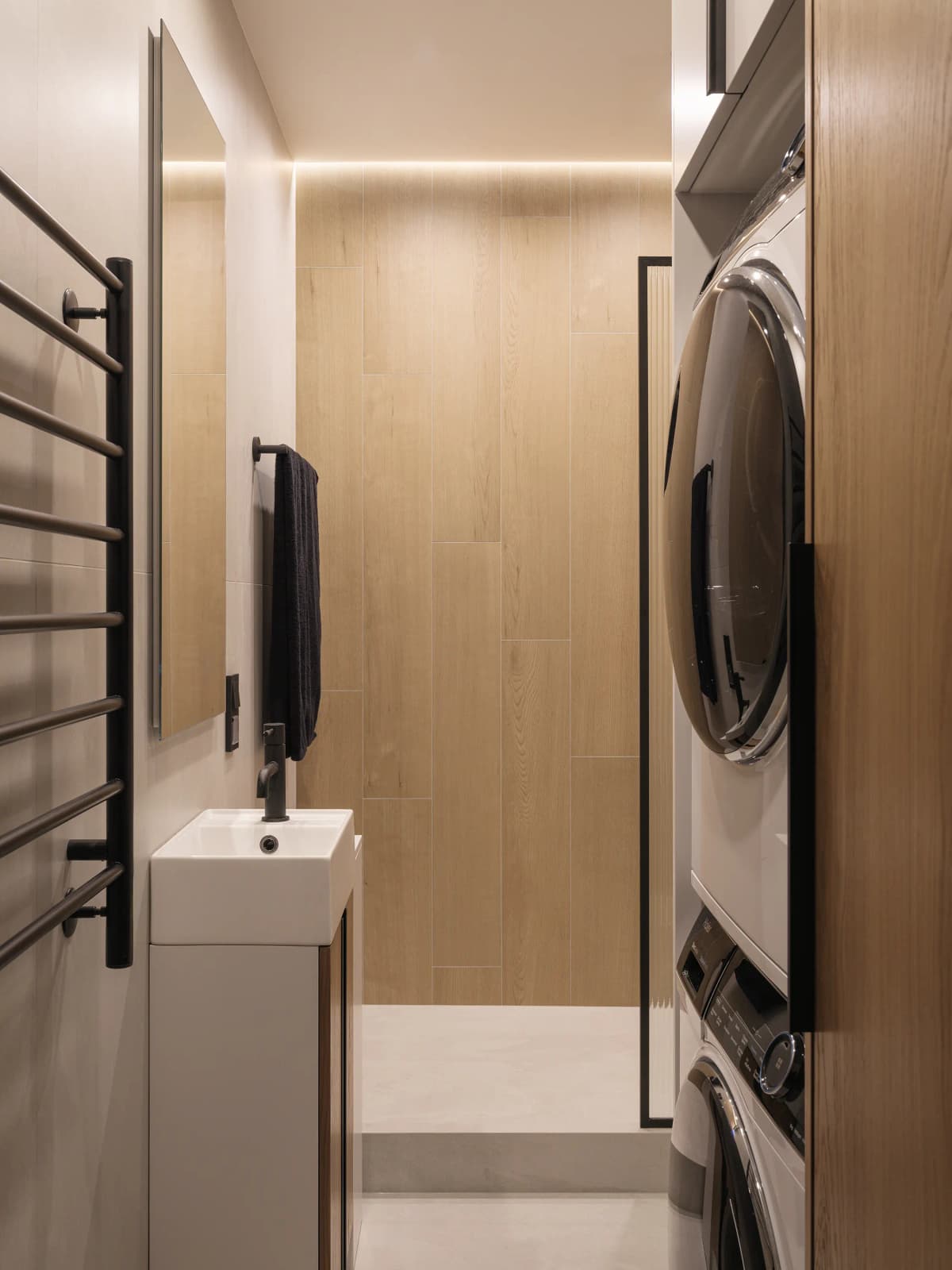 A full supply-and-exhaust ventilation system was implemented, with all equipment discreetly concealed above the ceiling in the utility area. The apartment benefits from unusually high ceilings (3.1 m), allowing the ventilation and ductwork to be integrated cleanly without affecting the minimalist aesthetic.